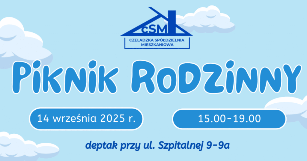 Czeladzka Spółdzielnia Mieszkaniowa serdecznie zaprasza wszystkich mieszkańców na Piknik Rodzinny, który odbędzie się 14 września 2025 r. (niedziela) w godz. 15:00–19:00 na deptaku przy ul. Szpitalnej 9–9a.